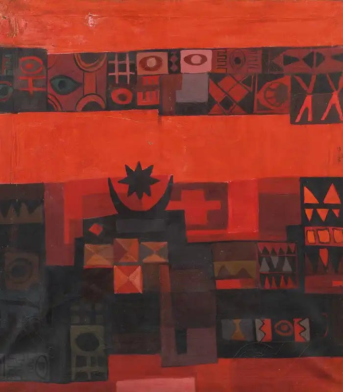 This synthesis is visible from his earliest works, where mythological and folkloric references stand alongside bold experimentation. One notable early painting, A Wolf Howls: Memories of a Poet (1968), created in the aftermath of regional upheavals including the Six-Day War, combines geometric abstraction with motifs inspired by Iraqi kilim rugs and an unpublished poem—an early testament to his interest in blending text, image, and cultural roots.