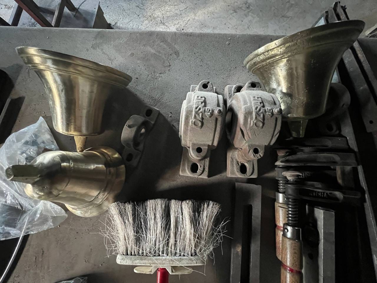 Today, the workshop feels suspended in time. Wooden tables carry decades of burn marks. Rows of heavy molds rest against the walls. Tools — some inherited, others handmade — hang in deliberate order. The scent of heated metal mingles with dust and oil.
