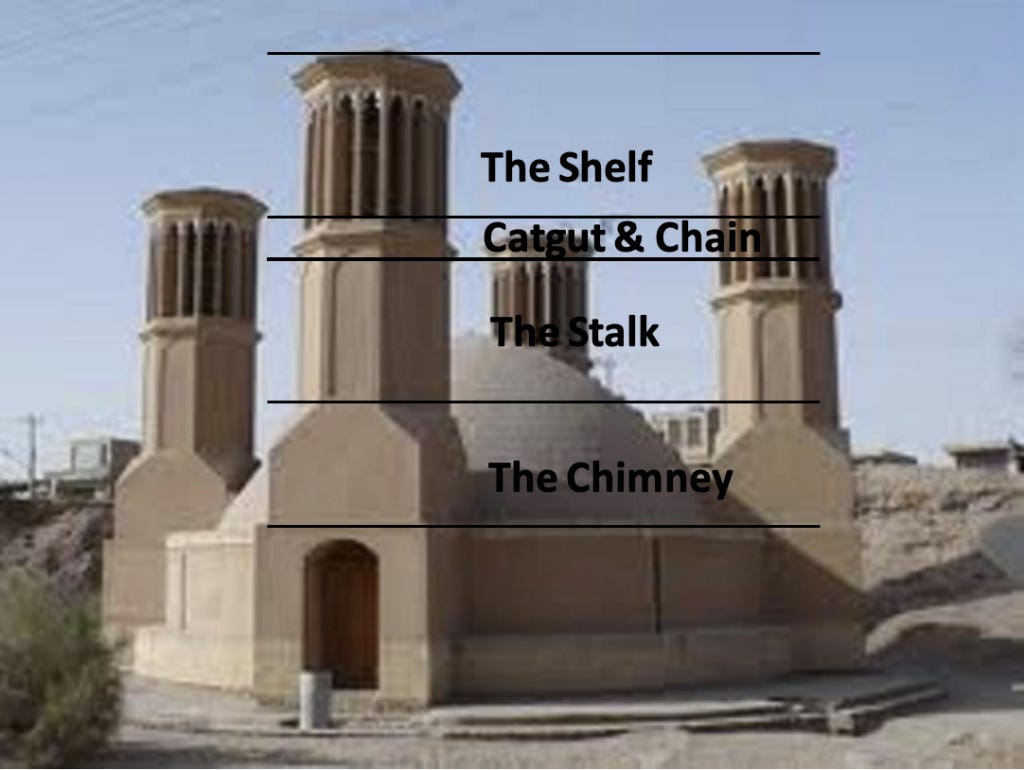 The wind catcher is composed of multiple elements, each essential to its overall function. The elements of a wind catcher, from bottom to top, are as follows: the chimney, the stalk, the catgut and chain, and the shelf.